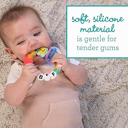 - Alívio suave para a DENTIÇÃO com um toque divertido: Fabricado com silicone macio e seguro para bebés para acalmar gengivas doloridas, com elementos coloridos tipo contas inspirados num brinquedo de dentição em forma de pulseira que inclui letras coloridas que formam a palavra “BFF”