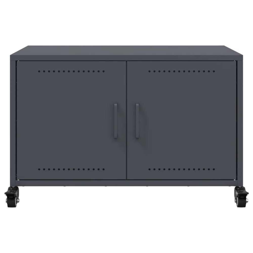 Este armário de TV é simples, prático e adapta-se perfeitamente à sua sala de estar. Material durável: o aço é um material excecionalmente duro e forte. Oferece robustez e estabilidade. As chapas de aço laminadas a frio têm boa qualidade de superfície e elevada precisão dimensional.Função de exposição: o tampo robusto da unidade multimédia é ideal para expor artigos decorativos, tais como molduras e plantas.Arrumação espaçosa: esta unidade de TV possui 2 portas que a tornam no lugar ideal para arrumar todas as suas revistas, DVDs e outros artigos.Fácil manutenção: este móvel de TV, com uma superfície resistente a manchas, é fácil de limpar e requer pouco esforço para o manter com o melhor aspeto possível.Fácil de deslocar: este móvel possui 4 rodas, permitindo-lhe deslocar-se de uma forma flexível e parar com estabilidade a qualquer momento.