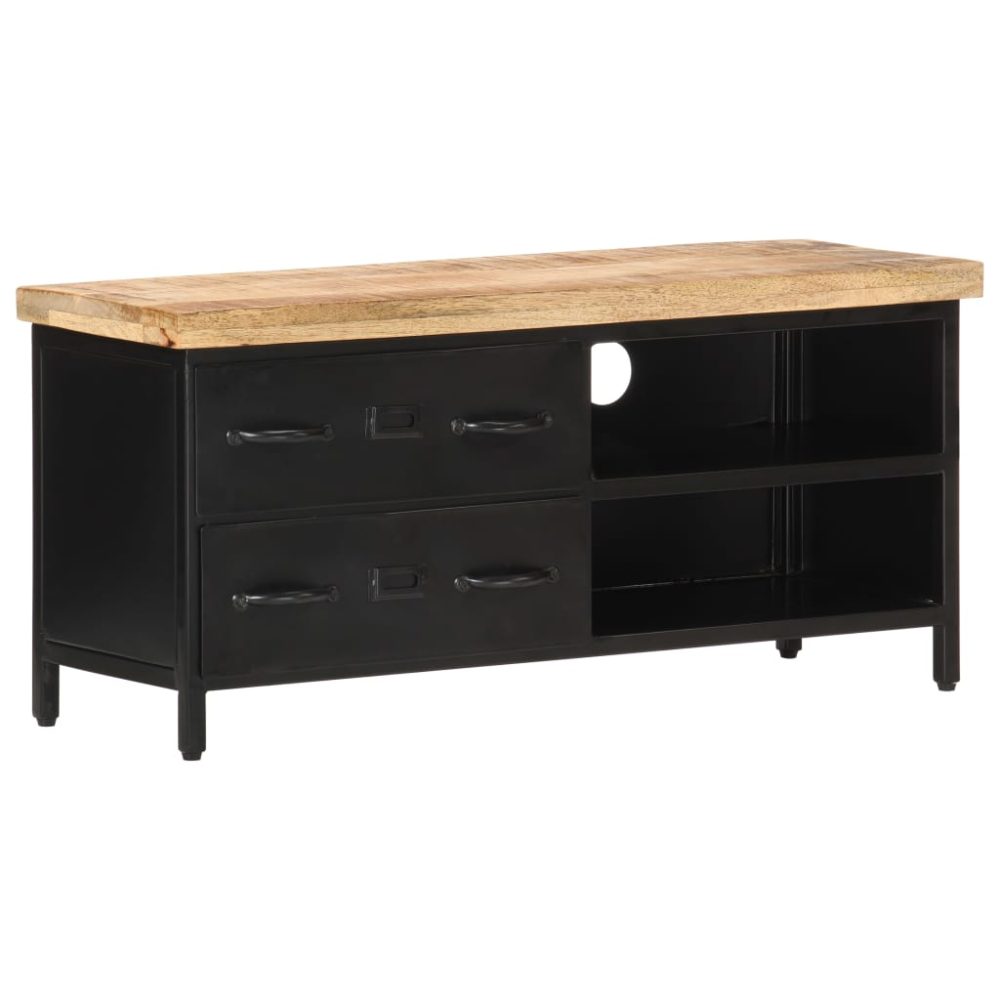 O móvel para estéreo é feito em madeira de mangueira áspera maciça, uma madeira tropical com força para suportar o peso. Também resiste ao desgaste causado pelo tempo, tornando o móvel estável e durável. A base de ferro revestido a pó preto combinado com aço oferece uma estabilidade extra a este móvel baixo. A artesania e os bonitos grãos da madeira tornam cada peça de mobiliário única e ligeiramente diferente das restantes. Esta unidade para multimédia também possui 2 gavetas e 2 compartimentos, proporcionando um amplo espaço de arrumação para manter os seus artigos importantes organizados e ao alcance.