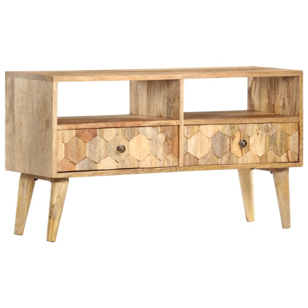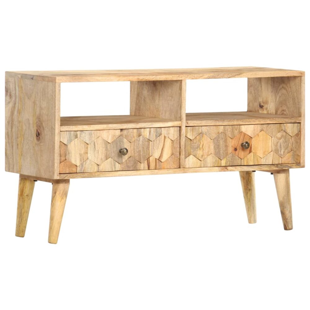 O nosso armário de TV em madeira será um complemento decorativo e prático para a sua decoração. O móvel para estéreo foi concebido à mão com madeira de mangueira maciça, o que o torna robusto e estável. A artesania e os bonitos grãos de madeira tornam cada peça de mobiliário única e ligeiramente diferente das restantes. Este suporte para TV também possui um amplo espaço de arrumação para manter os seus artigos importantes organizados e ao alcance. O móvel baixo é também fácil de montar. Nota importante: as cores e os grãos podem variar de peça para peça, tornando única cada uma das nossas peças. A entrega é aleatória.