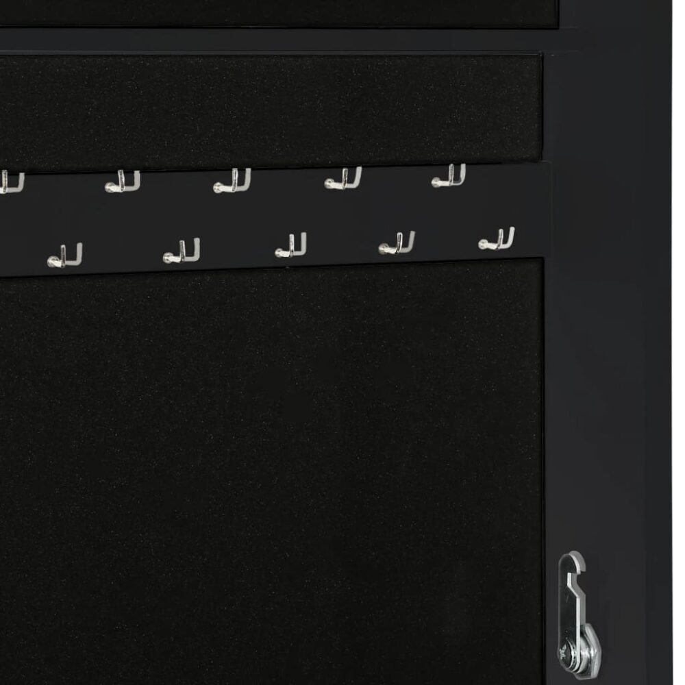 Mantenha as suas joias e perfumes discreta e elegantemente guardados com este elegante armário para joias espelhado! Material durável: os derivados de madeira possuem uma qualidade excecional e oferecem não só uma superfície suave mas também força, estabilidade e resistência à humidade. Feito a partir de derivados de madeira, este móvel para joias é fácil de limpar com um pano húmido.Amplo espaço de arrumação: o móvel de arrumação com espelho oferece muitos ganchos, suportes e prateleiras para poder manter as suas joias devidamente organizadas e ao seu alcance.Espelho ajustável: o espelho de comprimento total apresenta uma alta definição e pode refletir claramente todo o seu corpo sem qualquer deformação. O mais importante é que o espelho pode ser girado livremente em 3 posições diferentes, permitindo-lhe captar a sua beleza de vários ângulos.Proteção atenciosa: o móvel de arrumação de joias possui uma porta com fechadura e é fornecido com 2 chaves para garantir a segurança dos seus artigos. Além disso, a capa em tecido macio no interior não só acrescenta elegância como também protege as suas apreciadas joias de riscos.Design independente: este organizador de joalharia independente é fácil de colocar em qualquer espaço do seu quarto, sala de estar, etc. A base de 2 pés mantém esta caixa de joalharia com espelho equilibrada e estável, mesmo quando o seu interior está carregado. Atenção:Para evitar que o produto se vire, deve utilizar o dispositivo de fixação na parede fornecido.