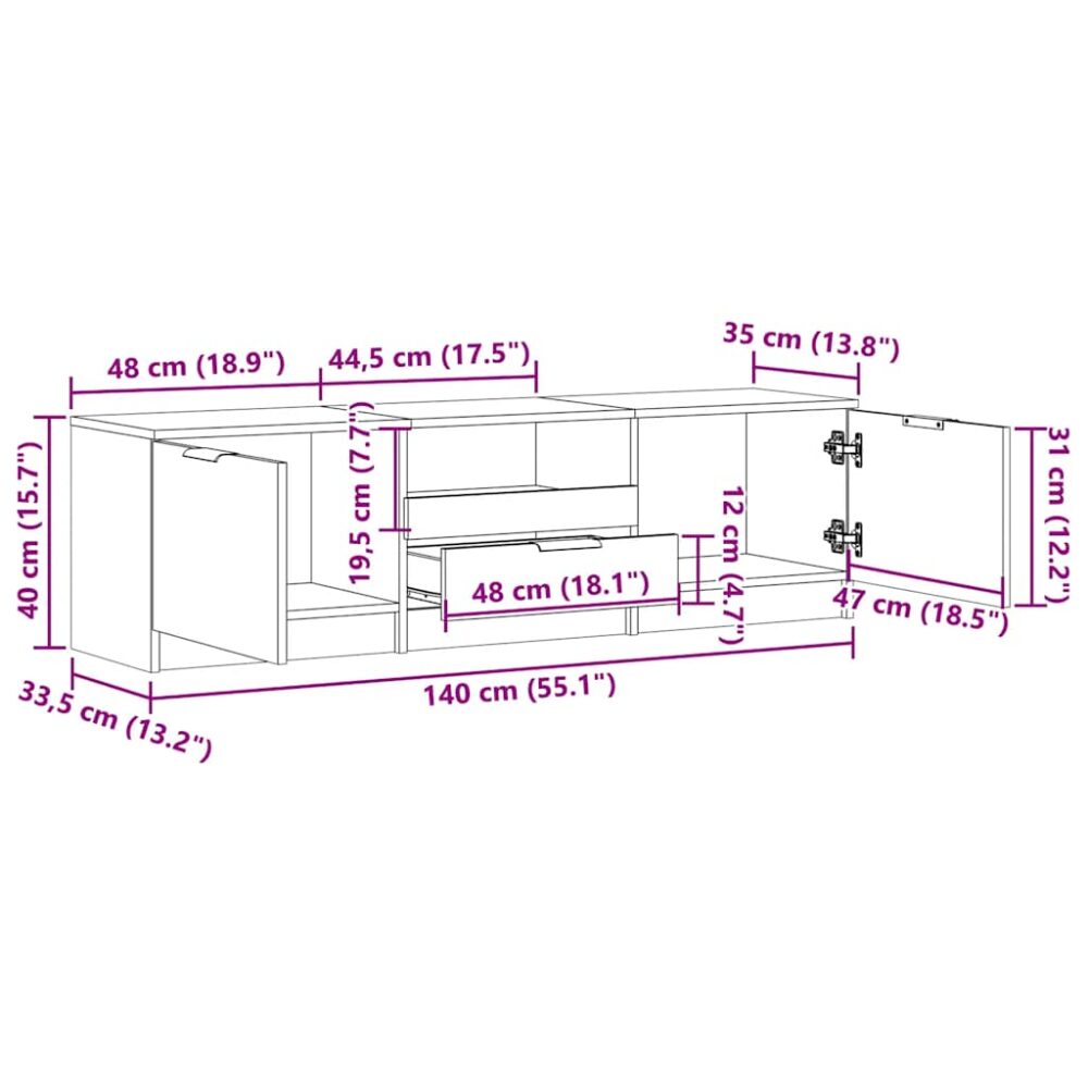 Este armário de televisão, com um amplo espaço de arrumação, é um complemento prático e atraente para a sua sala de estar ou quarto. Material estável e durável: os derivados de madeira são um material durável e estável com uma superfície lisa que é resistente à humidade, deformação e rachadelas, tornando-se uma escolha fiável para uma variedade de projetos.Amplo espaço de armazenamento: Este suporte de TV oferece um amplo espaço de armazenamento para manter as suas revistas, livros, DVD e dispositivos multimédia bem organizados e ao seu alcance.Tampo estável e robusto: o tampo robusto é ideal para colocar a sua TV e sistemas de som ou alguns artigos decorativos, tais como vasos com plantas.Fácil manutenção: Graças à sua superfície lisa, o aparador de TV é fácil de limpar com um pano húmido e requer menos manutenção.