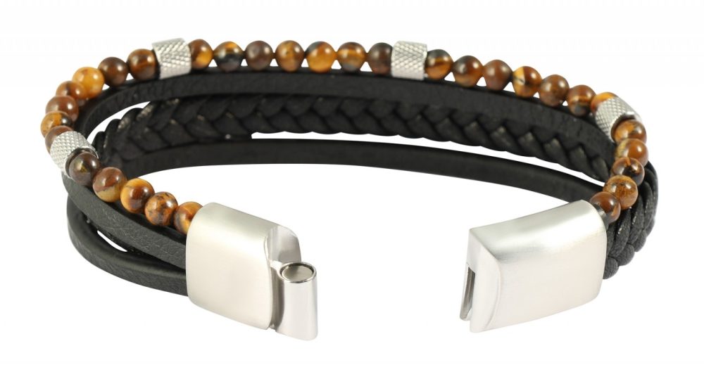 Nanno – elegância natural no pulso A elegante pulseira “Nanno” para o homem moderno que valoriza a elegância individual. Três fios de Pele Sintética – ora lisos, ora trançados – harmonizam-se perfeitamente com o quarto fio, decorado com pedras naturais e elementos de aço inoxidável. O fio de pedra natural impressiona pela combinação de pedras de sílex (Ø de 4,5 mm) e aço inoxidável, que conferem à pulseira uma elegância e sofisticação especial. Esta perfeita união de materiais de alta qualidade e excelente acabamento faz do “Nanno” um item obrigatório para o homem moderno. O prático fecho magnético facilita a colocação e a retirada e garante uma fixação segura.