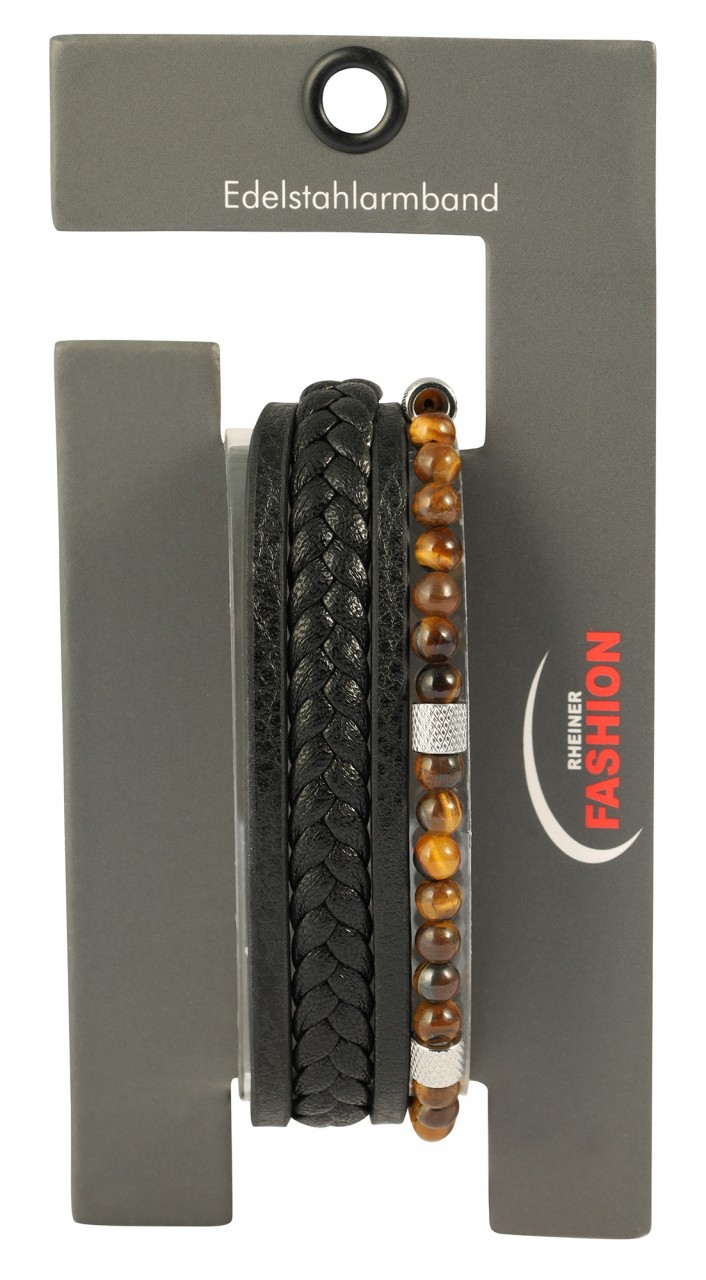 Nanno - elegância natural no pulso A elegante pulseira “Nanno” para o homem moderno que valoriza a elegância individual. Três fios de Pele Sintética - ora lisos, ora trançados - harmonizam-se perfeitamente com o quarto fio, decorado com pedras naturais e elementos de aço inoxidável. O fio de pedra natural impressiona pela combinação de pedras de sílex (Ø de 4,5 mm) e aço inoxidável, que conferem à pulseira uma elegância e sofisticação especial. Esta perfeita união de materiais de alta qualidade e excelente acabamento faz do "Nanno" um item obrigatório para o homem moderno. O prático fecho magnético facilita a colocação e a retirada e garante uma fixação segura.