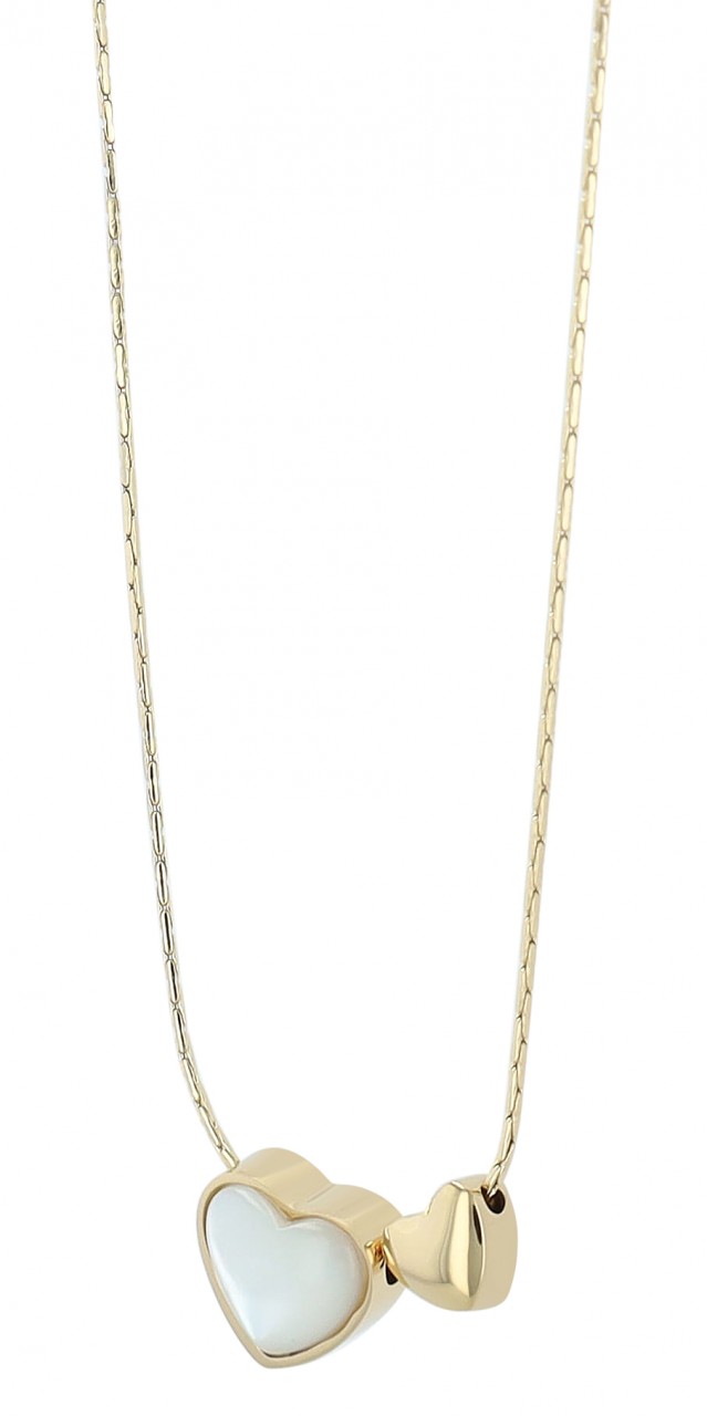 Feito de aço inoxidável, este acessório apresenta um design moderno com elegância romântica. O pingente principal, um coração (C 7 mm / L 8 mm) carinhosamente emoldurado com madrepérola brilhante, é complementado por outro delicado coraçãozinho. Ambos os pingentes estão firmemente integrados à corrente para que não se percam. Com um comprimento de corrente de 41 cm e uma extensão de 5 cm, esta joia se adapta com flexibilidade a qualquer decote. O elegante acabamento dourado dá ao colar um toque luxuoso – perfeito para quem quer adicionar um toque de estilo.