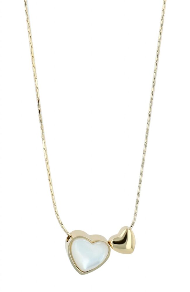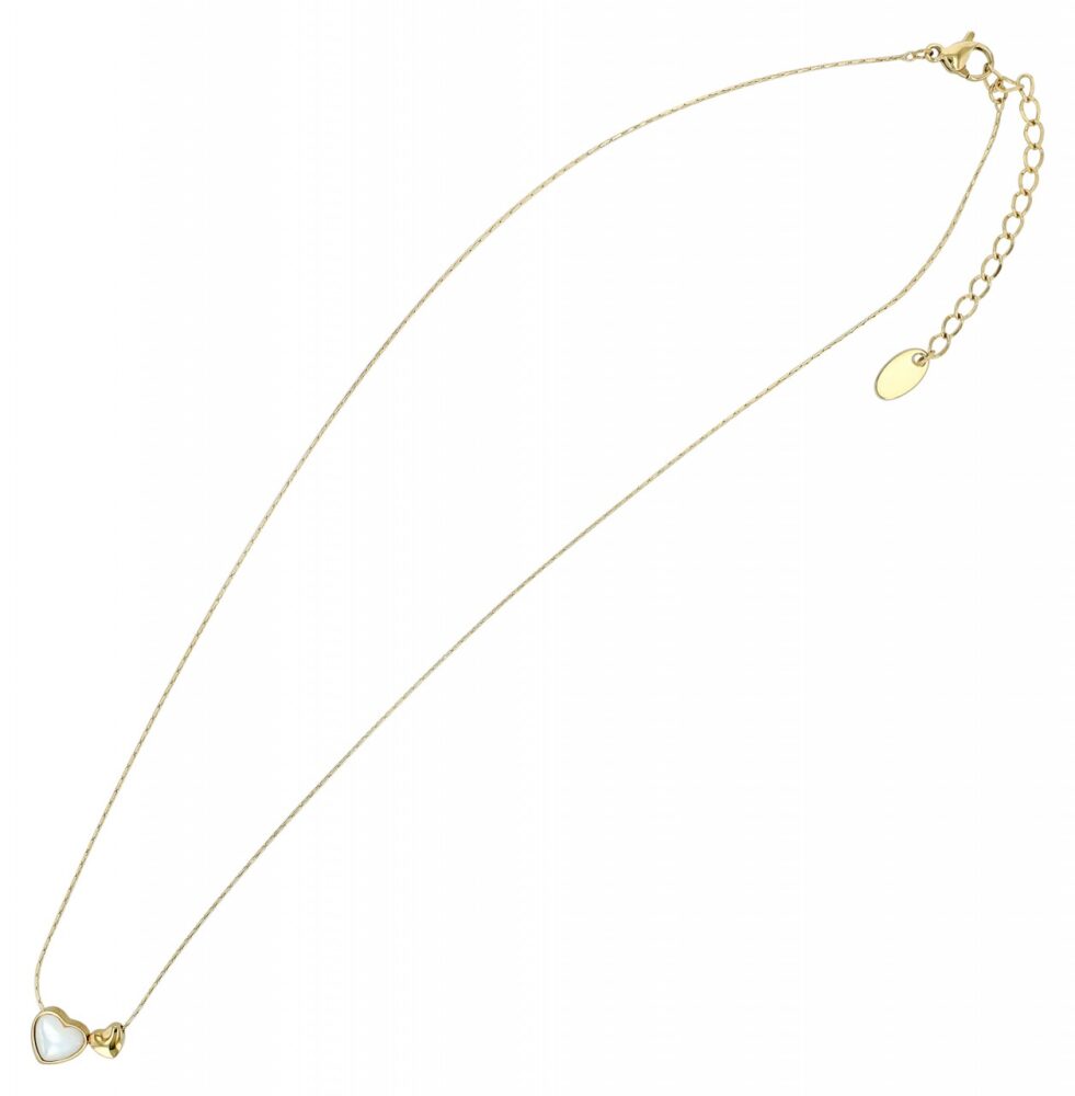 Feito de aço inoxidável, este acessório apresenta um design moderno com elegância romântica. O pingente principal, um coração (C 7 mm / L 8 mm) carinhosamente emoldurado com madrepérola brilhante, é complementado por outro delicado coraçãozinho. Ambos os pingentes estão firmemente integrados à corrente para que não se percam. Com um comprimento de corrente de 41 cm e uma extensão de 5 cm, esta joia se adapta com flexibilidade a qualquer decote. O elegante acabamento dourado dá ao colar um toque luxuoso – perfeito para quem quer adicionar um toque de estilo.