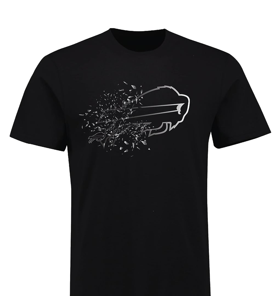 Elegante t-shirt de adepto de equipa de futebol americano Buffalo Bills. Logotipo da equipa estampado em estilo Shatter na frente.