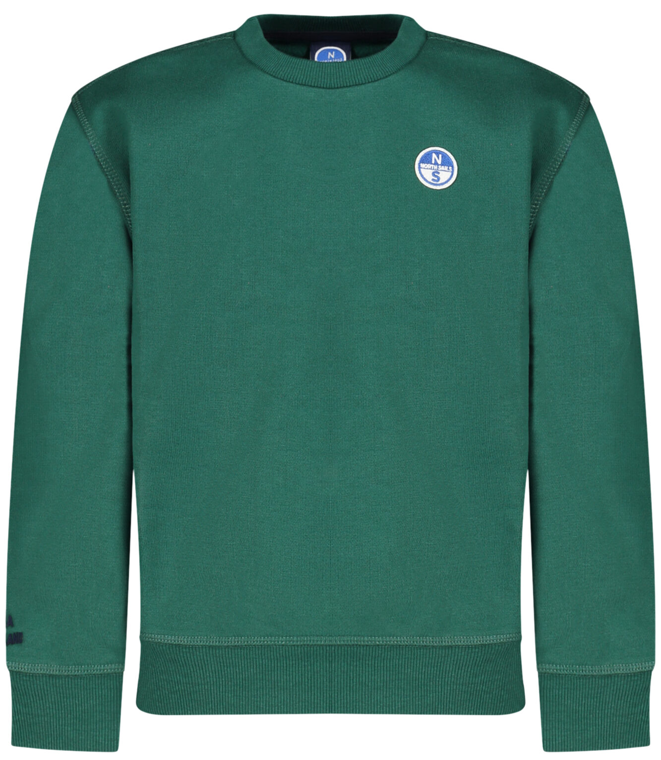 Possui gola redonda, aplicação decorativa e logotipo, combinando estilo casual com um toque sustentável.