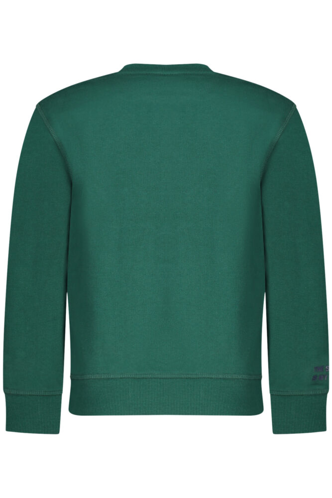 Possui gola redonda, aplicação decorativa e logotipo, combinando estilo casual com um toque sustentável.