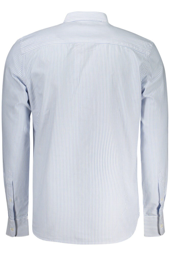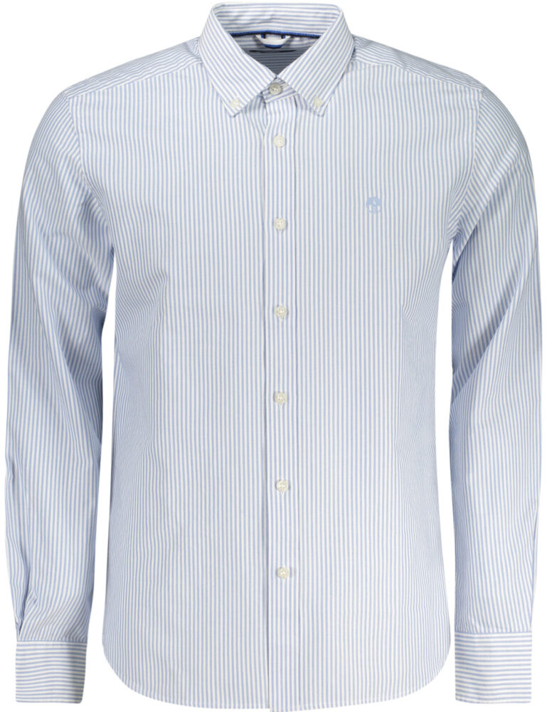 Camisa de mangas compridas com riscas azuis, gola com botões e punhos com fecho de 1 botão.