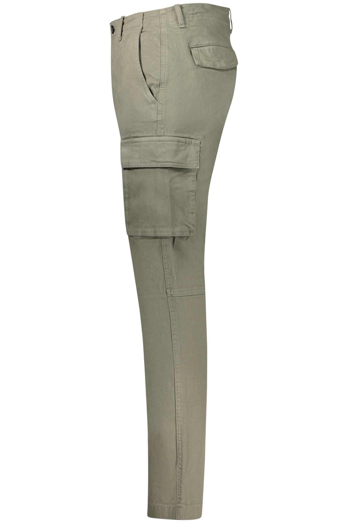 Calças de corte regular com quatro bolsos, incluindo dois bolsos laterais, fechamento com botão e fecho de correr.