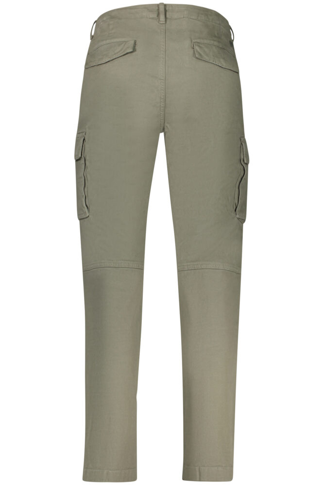 Calças de corte regular com quatro bolsos, incluindo dois bolsos laterais, fechamento com botão e fecho de correr.