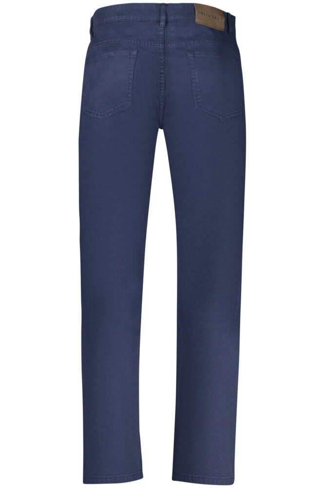 Calças de corte regular com cinco bolsos, fechamento com botão e fecho de correr.