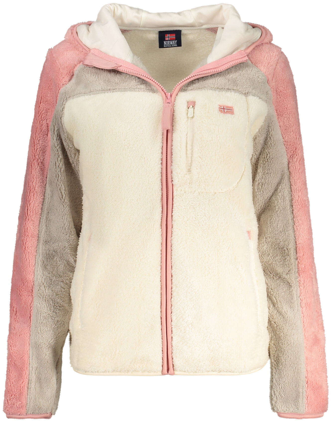Casaco tipo camisola com capuz e mangas compridas, com 3 bolsos exteriores, fecho de correr frontal, detalhes em contraste, bordado decorativo e logótipo da marca.