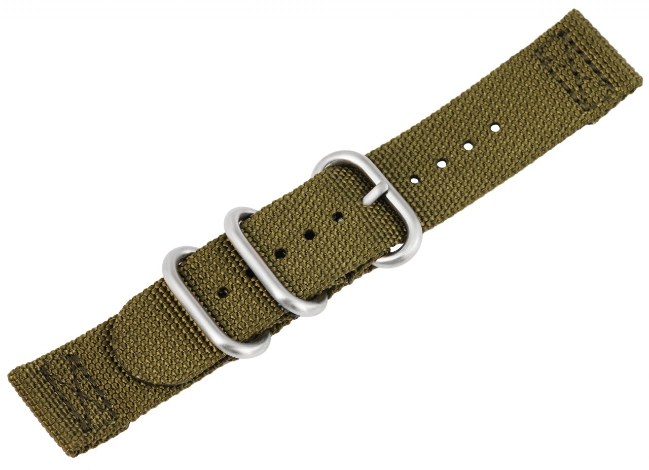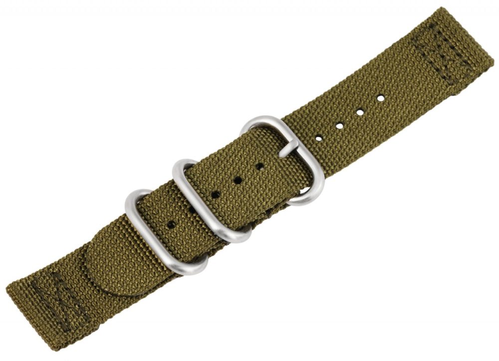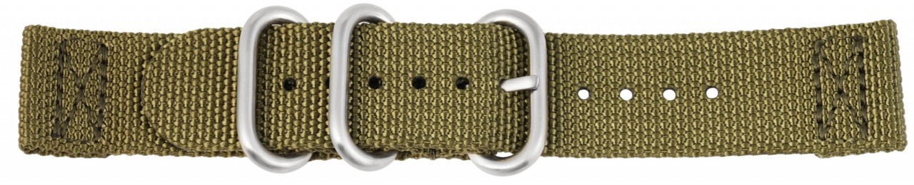 A pulseira de relógio em nylon verde oliva está disponível em larguras de 20 mm e 22 mm. Ele pode ser facilmente fixado à caixa do relógio usando duas barras de mola padrão. A pulseira do relógio tem um comprimento total de 21,5 cm. A pulseira pode ser aberta e fechada com uma fivela prateada. Além disso, duas presilhas de metal prateado estão firmemente costuradas na pulseira. O material macio torna a pulseira do relógio particularmente confortável de usar. A aparência simples permite que a pulseira de reposição seja fixada em qualquer tipo de relógio. Combina bem com a aparência geral dos relógios.