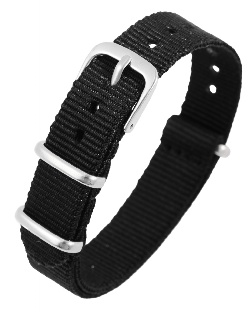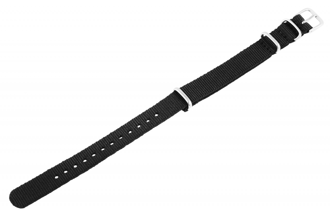A pulseira de náilon preta está disponível em larguras de 14 mm, 16 mm, 18 mm, 20 mm e 22 mm. A pulseira pode ser aberta e fechada com uma fivela prateada. Além disso, dois laços de metal estão firmemente costurados na pulseira. O material macio torna a pulseira do relógio particularmente confortável de usar. A aparência simples permite que a pulseira de reposição seja fixada em qualquer tipo de relógio. Combina bem com a aparência geral dos relógios.