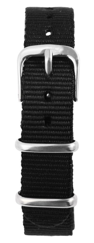 A pulseira de náilon preta está disponível em larguras de 14 mm, 16 mm, 18 mm, 20 mm e 22 mm. A pulseira pode ser aberta e fechada com uma fivela prateada. Além disso, dois laços de metal estão firmemente costurados na pulseira. O material macio torna a pulseira do relógio particularmente confortável de usar. A aparência simples permite que a pulseira de reposição seja fixada em qualquer tipo de relógio. Combina bem com a aparência geral dos relógios.