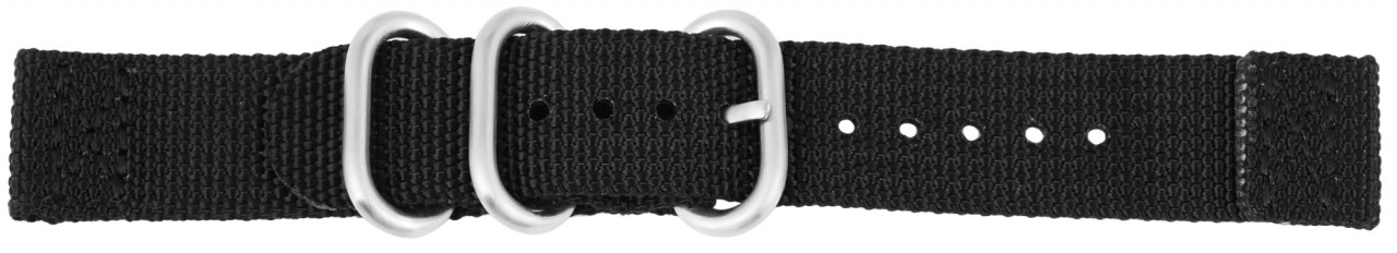 A pulseira de nylon preta está disponível em larguras de 20 mm e 22 mm. Ele pode ser facilmente fixado à caixa do relógio usando duas barras de mola padrão. A pulseira do relógio tem um comprimento total de 21,5 cm. A pulseira pode ser aberta e fechada com uma fivela prateada. Além disso, duas presilhas de metal prateado estão firmemente costuradas na pulseira. O material macio torna a pulseira do relógio particularmente confortável de usar. A aparência simples permite que a pulseira de reposição seja fixada em qualquer tipo de relógio. Combina bem com a aparência geral dos relógios.