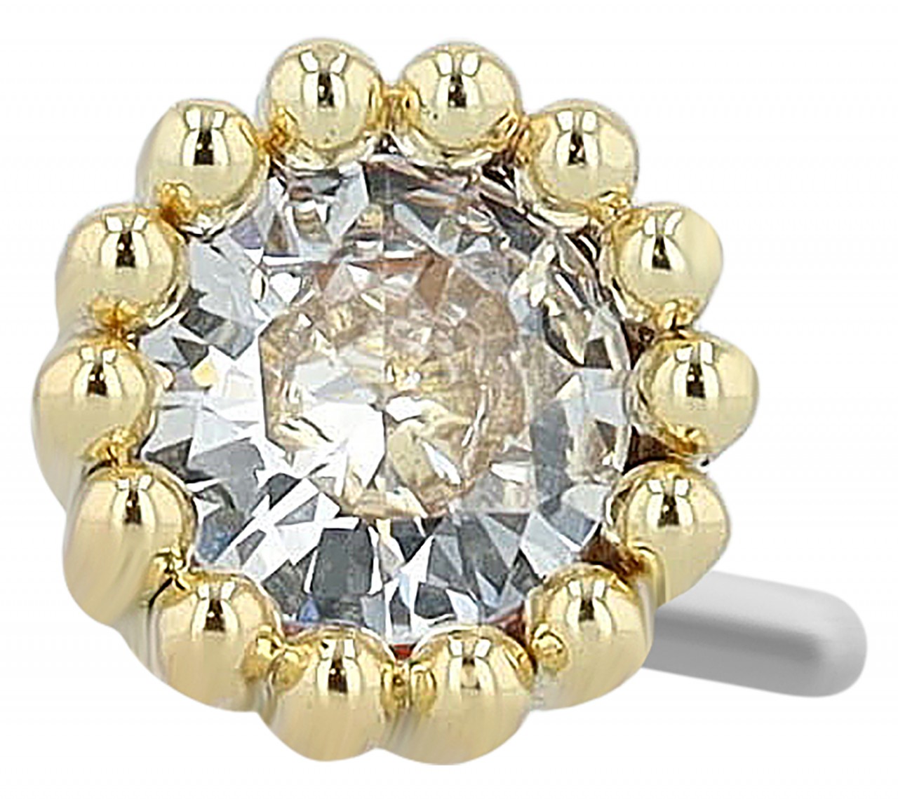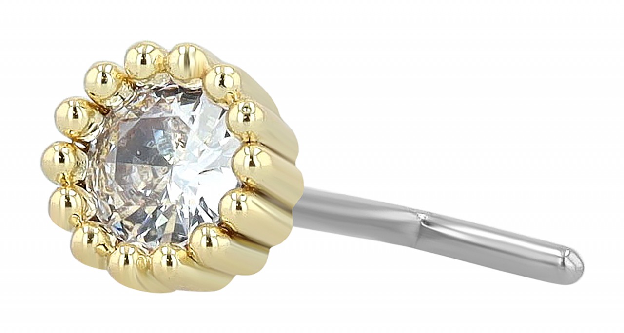 O tampão amovível (5 x 4 x 4 mm) em forma de gota decorado com um zircão, uma peça de joalharia versátil.
