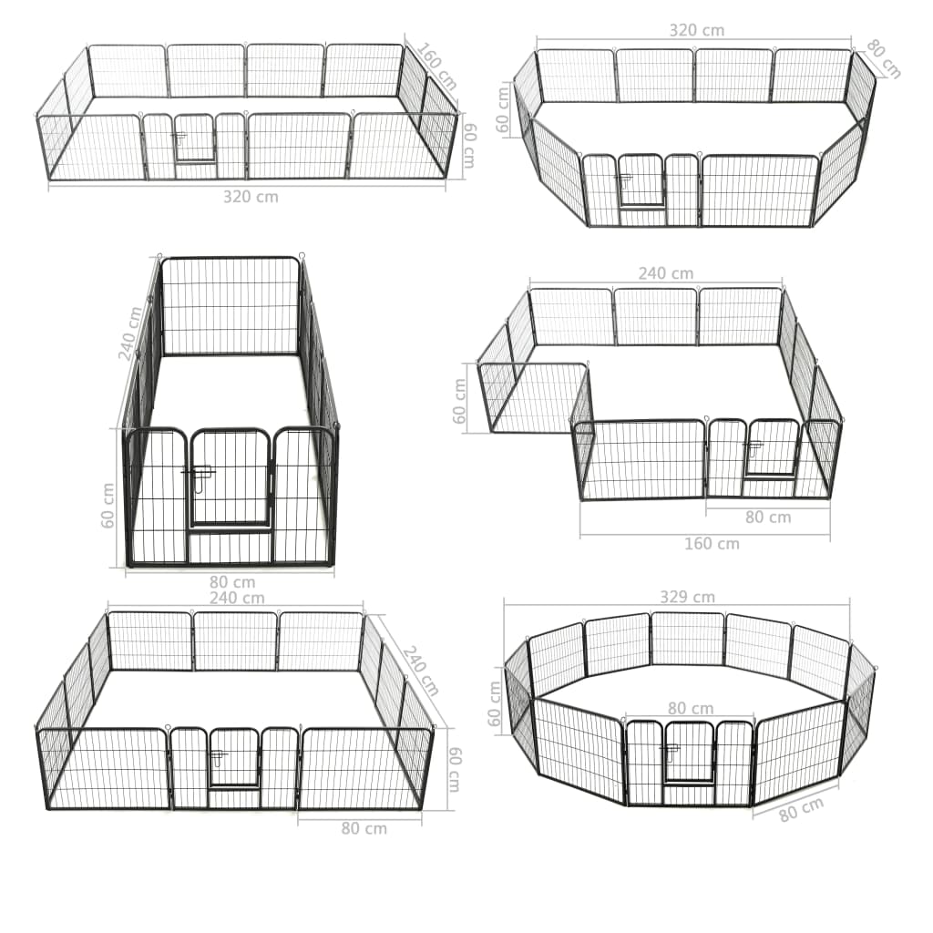 Este canil pode ser facilmente montado ou desmontado. É composto por 12 painéis resistentes e cada painel pode ser facilmente anexado ao seguinte, o que lhe permite configurar o parque em diferentes formas. O recinto para cães possui uma porta articulada com um trinco de segurança para facilitar o acesso. Este parque para cães durável e resistente às condições meteorológicas é feito de aço revestido a pó à prova de ferrugem, tornando-o adequado para uso exterior e interior. As estacas incluídas ajudam a fixar o parque no exterior para maior estabilidade e segurança.