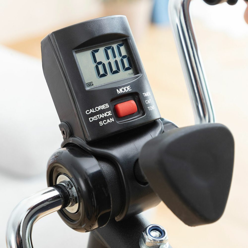 - Contador digital: o nosso pedalador duplo para braços e pernas dispõe de um contador digital de atividade com medição de voltas, tempo, calorias e distância. O contador é extraível e pode ser colocado na parte superior ou inferior, consoante a necessidade de contar a atividade nos pedais de mão ou de pé.