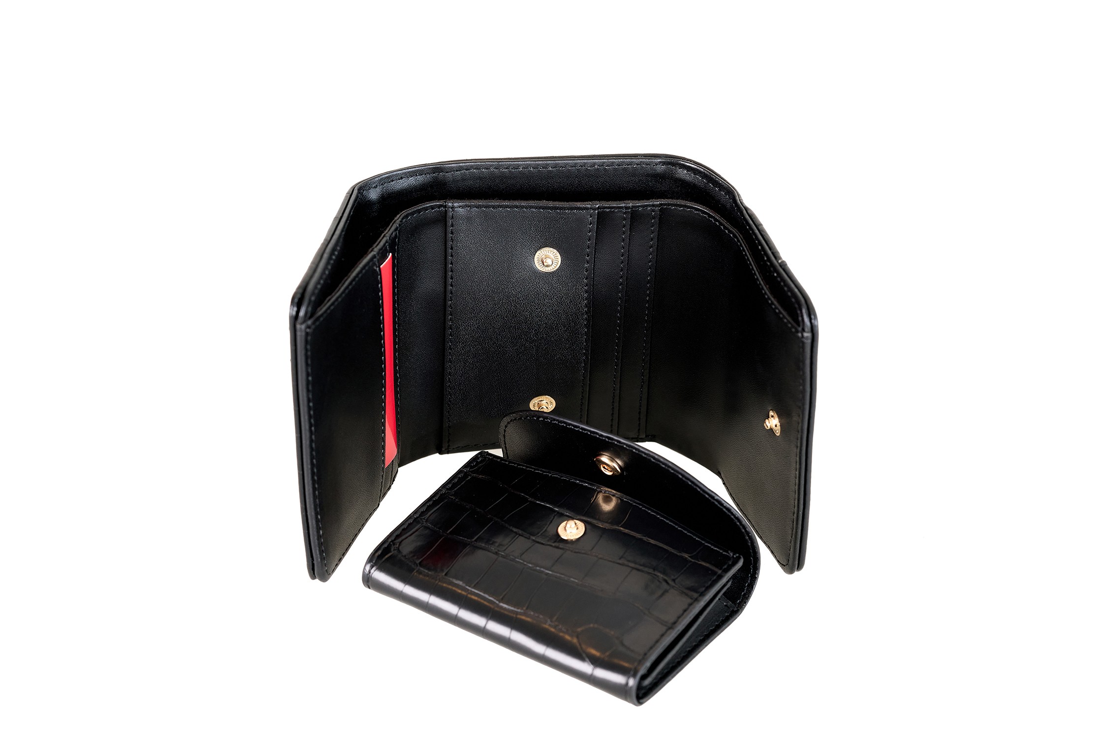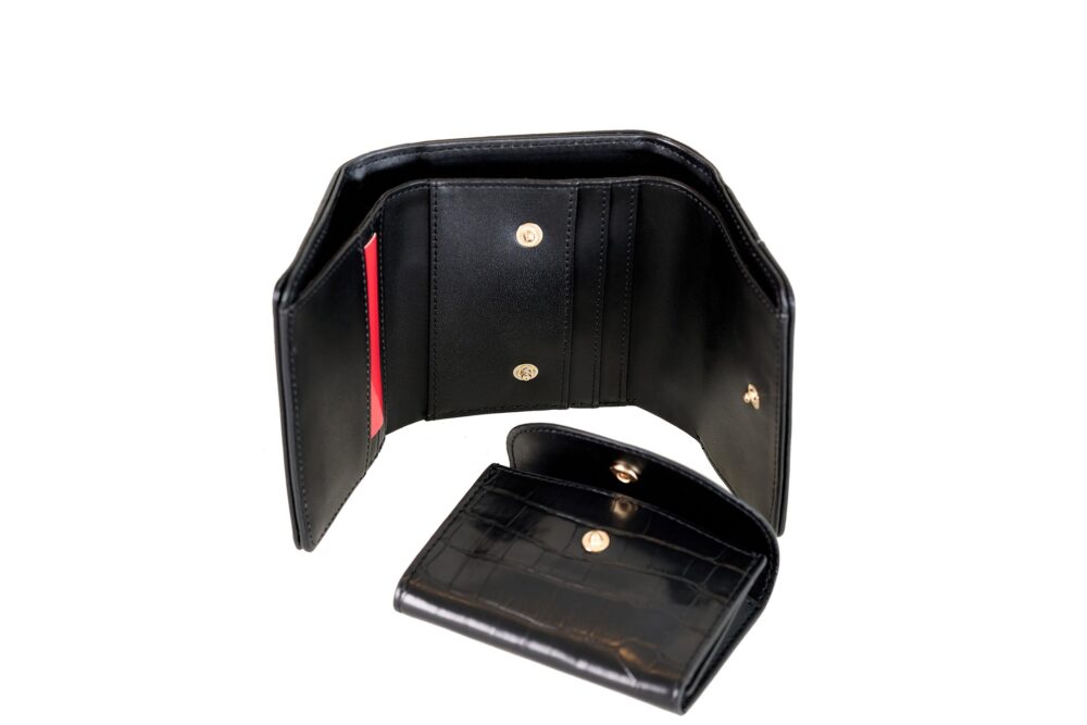 Bolsa com fecho de clipe e compartimentos internos para cartões, moedas e notas em couro ecológico