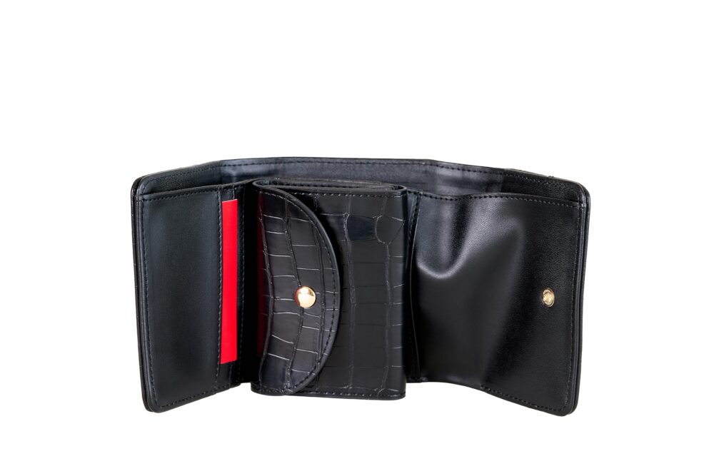 Bolsa com fecho de clipe e compartimentos internos para cartões, moedas e notas em couro ecológico