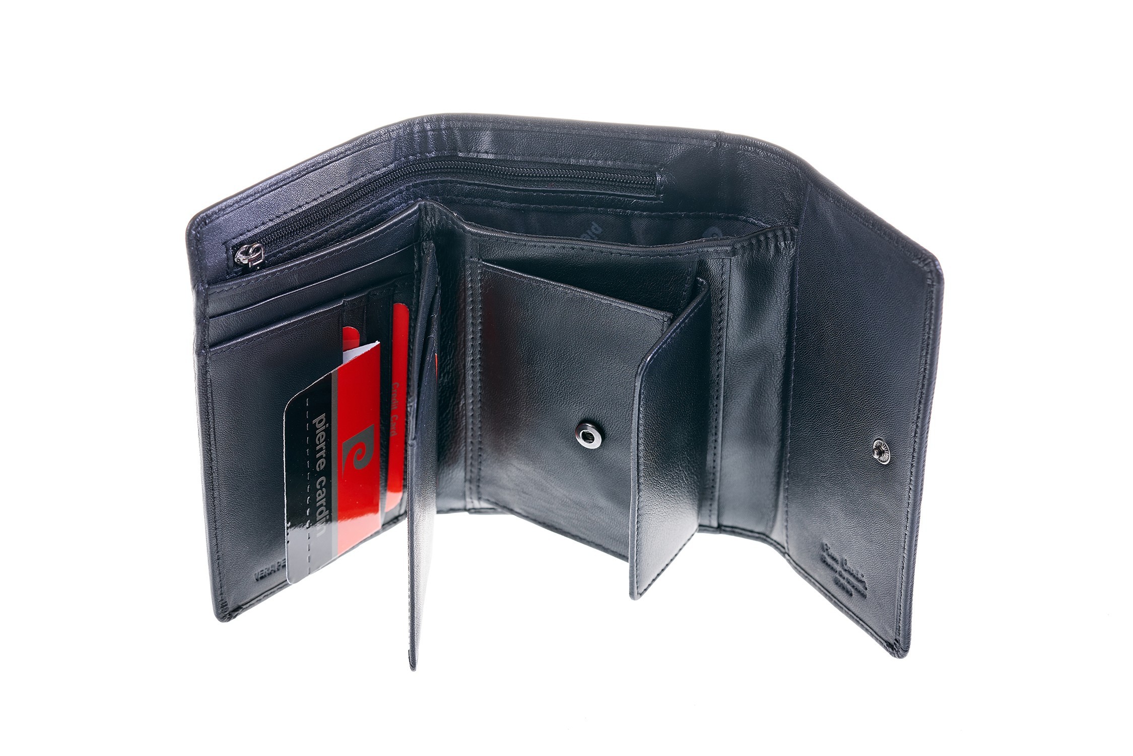Interior em couro com seção para porta moedas, três seções para porta cartões, porta notas e bolso com fecho