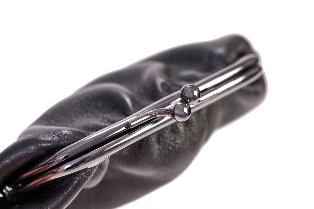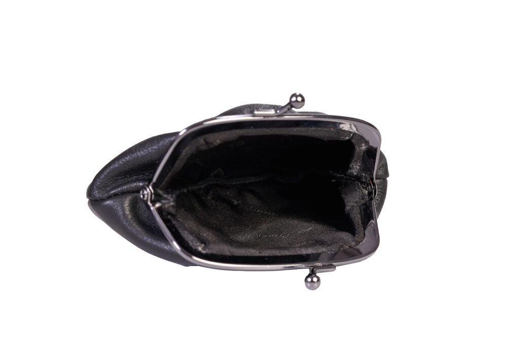 Bolsa de couro com fecho de clipe e compartimentos internos para cartões, moedas e notas