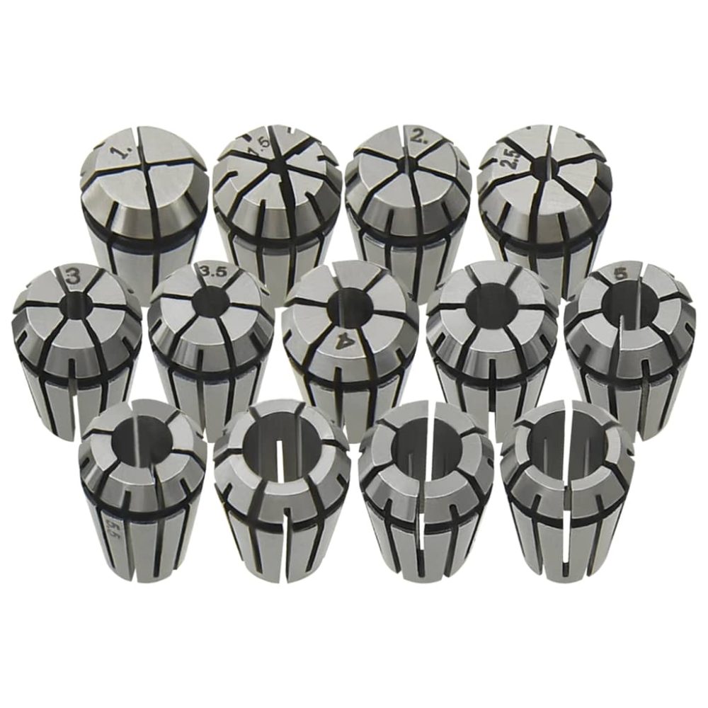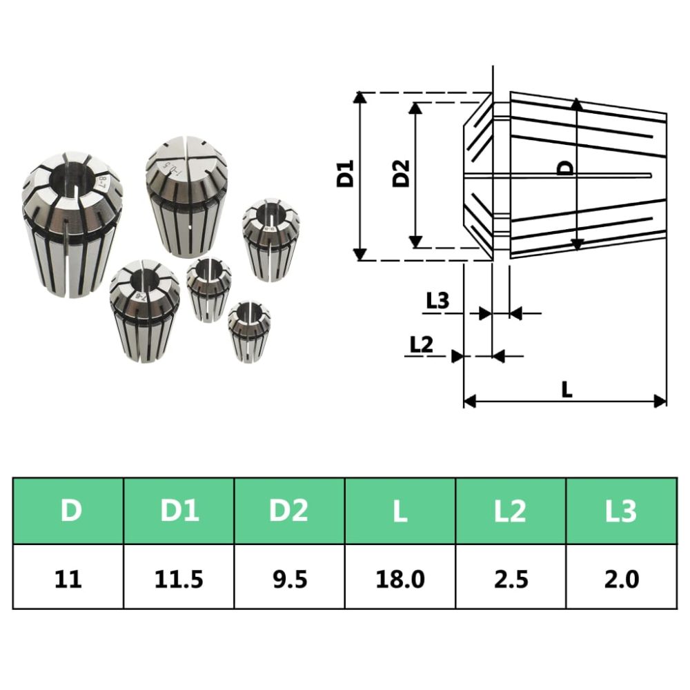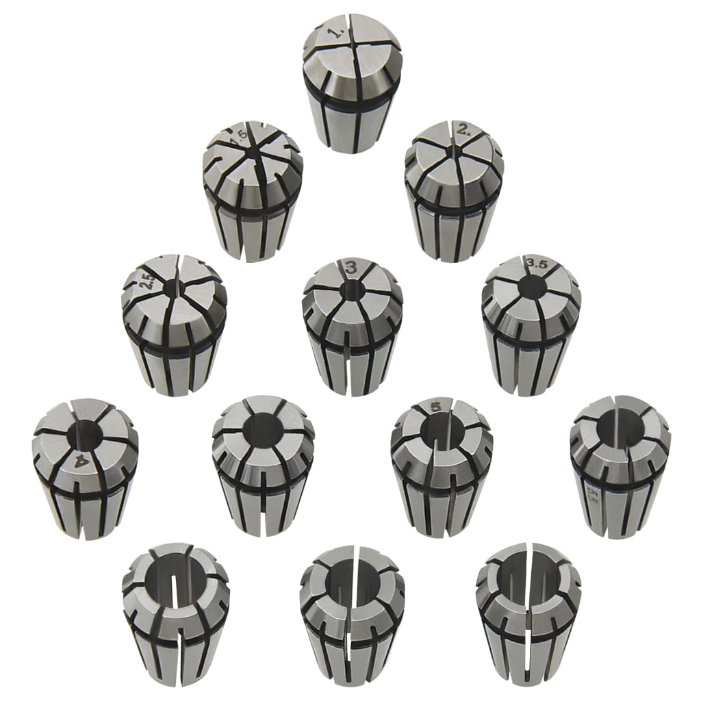 Estas pinças ER11 compostas por 13 pcs são adequadas para mandrilar, fresar, furar, roscar, gravação, CNC, máquinas de fuso e trabalhos semelhantes. O conjunto possui um intervalo de aperto de 1 mm a 7 mm.