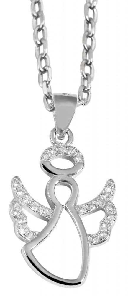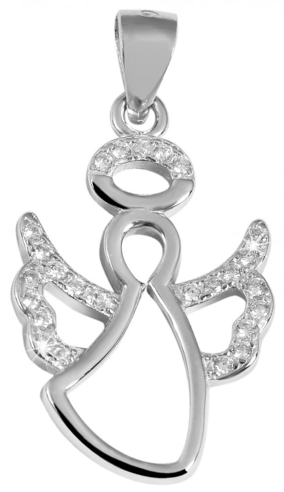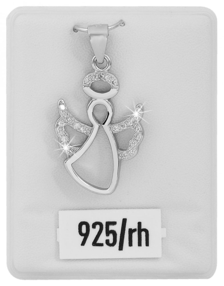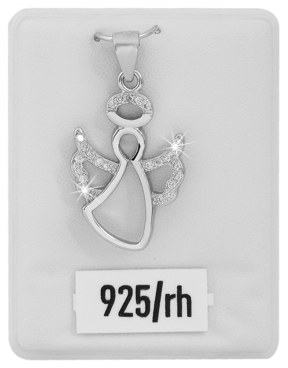 O pingente do colar em forma de anjo da guarda é feito de prata esterlina 925 e adicionalmente banhado a ródio. O revestimento de ródio garante brilho radiante e protege o material contra manchas. O pingente é um ótimo companheiro com seus detalhes sofisticados. O anjo está aberto por dentro, apenas a borda mostra o formato de um anjo. As asas e a auréola são incrustadas com 24 pedras de zircônia branca. O pingente de anjo pode ser facilmente preso usando um ilhó de corrente oval. O pingente é entregue SEM corrente. O tamanho do pingente é 22 mm de comprimento, 15 mm de largura e 2,5 mm de espessura.