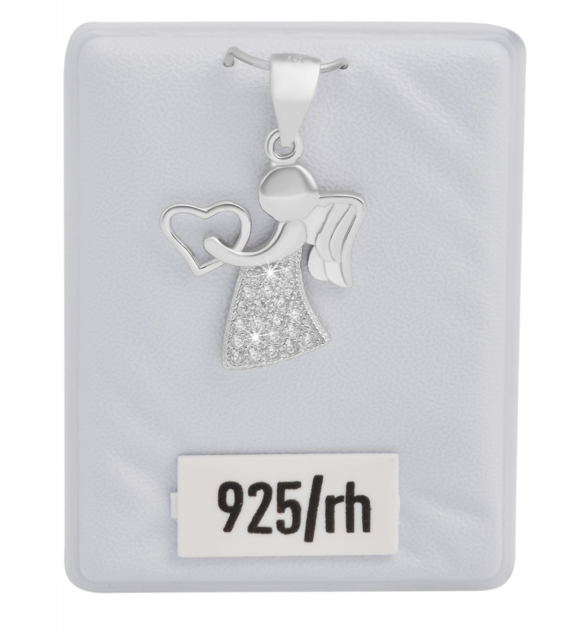 O pingente em forma de anjo feito de prata esterlina 925 é decorado com 22 pequenas pedras de zircônia e segura um pequeno coração nas mãos. É ideal para presentear uma pessoa muito especial. O anjo traz boa sorte e é um ótimo acessório para jovens e idosos. Graças ao ilhó oval, o pingente pode ser preso a qualquer corrente. Ao adquirir este produto observe que ele é apenas o pingente e é entregue sem corrente. O item possui dimensões de: comprimento 18 mm, largura 15 mm e espessura 2 mm.
