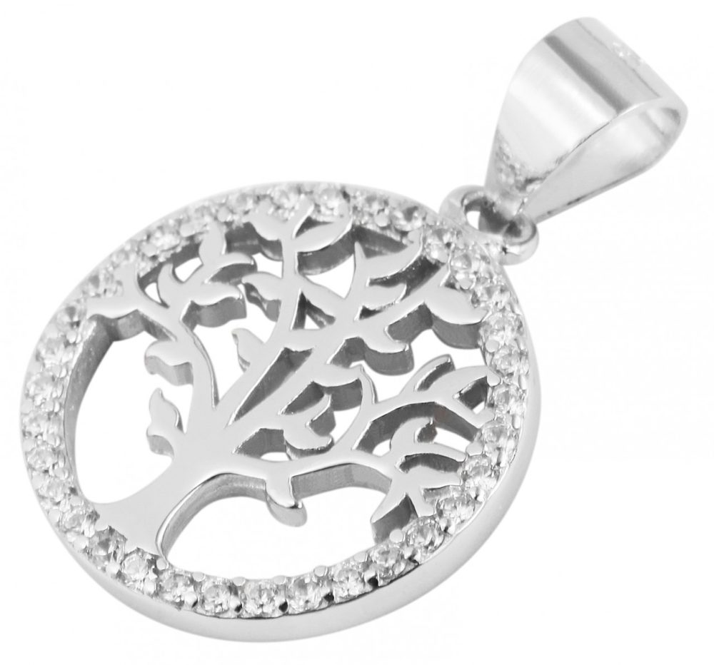 O pingente redondo com motivo da árvore da vida é feito de prata esterlina 925 e também tem acabamento em ródio. Este revestimento protege a joia de manchas e garante um brilho duradouro. O pingente é decorado ao redor com 34 pedras brilhantes de zircônia em uma configuração de pinos, que proporcionam um destaque visual. Além disso, existem numerosos recortes no interior do pingente redondo para que possa ser visto o motivo da árvore da vida.