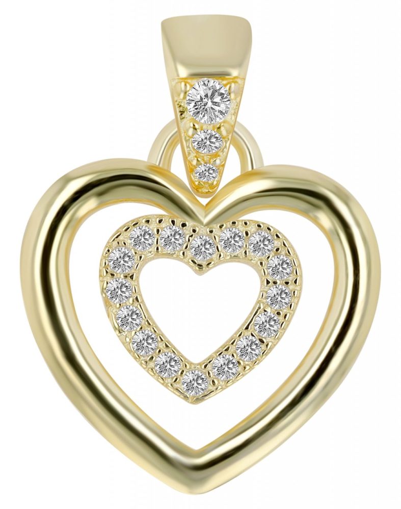 Este elegante pingente de coração feito em prata 925 banhado a ródio ou ouro apresenta uma fusão graciosa de romance e elegância. O pingente consiste em dois corações. Com dimensões de 12 x 14 x 2 mm, o pingente tem um tamanho elegante. O coração interno é incrustado com 17 pedras cintilantes de zircônia que criam um brilho radiante a cada movimento. O ilhó também é decorado com 3 pedras de zircônia. O revestimento de ródio protege o pingente de manchas e confere à joia um brilho especial. A versão banhada a ouro confere ao pingente um toque aconchegante e luxuoso. O pingente é entregue sem corrente. Usando o ilhó, o pingente de corrente pode ser preso a todos os tipos comuns de correntes. Além disso, pode ser combinado com outras peças de joalheria.