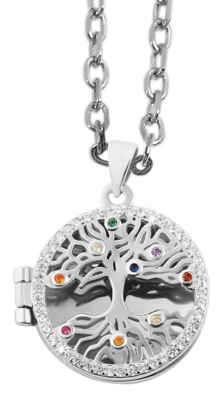 O medalhão com a árvore da vida foi feito em prata de lei 925 e adicionalmente banhado a ródio. O revestimento de ródio de alta qualidade garante um brilho radiante e evita manchas no material. A tendência dos medalhões não mudou ao longo dos anos, a procura ainda é muito elevada. O pingente pode ser aberto e fechado e é ideal para guardar pequenos itens pessoais ou lembranças de vários tipos. O pingente moderno está equipado com detalhes finos. 46 pedras de zircônia branca decoram toda a borda do pingente. As folhas da árvore são substituídas por outras 9 pedras coloridas de zircônia. Pequenos recortes na frente permitem que você veja o interior. O verso é polido e pode receber gravuras menores.