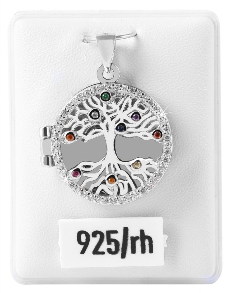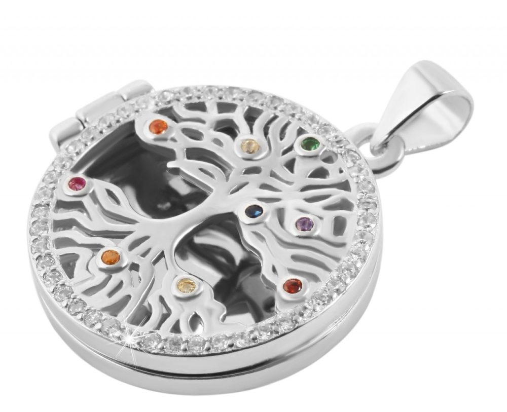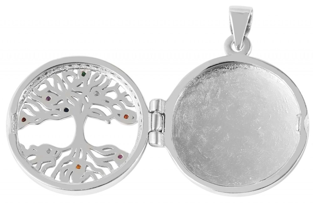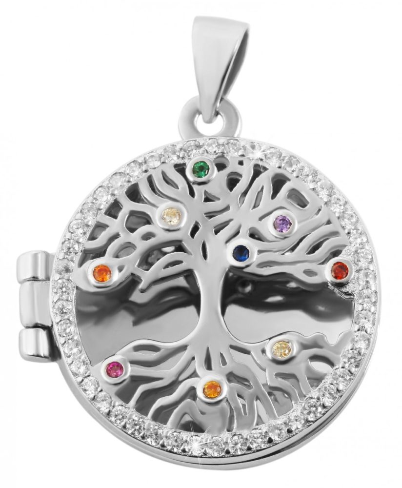 O medalhão com a árvore da vida foi feito em prata de lei 925 e adicionalmente banhado a ródio. O revestimento de ródio de alta qualidade garante um brilho radiante e evita manchas no material. A tendência dos medalhões não mudou ao longo dos anos, a procura ainda é muito elevada. O pingente pode ser aberto e fechado e é ideal para guardar pequenos itens pessoais ou lembranças de vários tipos. O pingente moderno está equipado com detalhes finos. 46 pedras de zircônia branca decoram toda a borda do pingente. As folhas da árvore são substituídas por outras 9 pedras coloridas de zircônia. Pequenos recortes na frente permitem que você veja o interior. O verso é polido e pode receber gravuras menores.