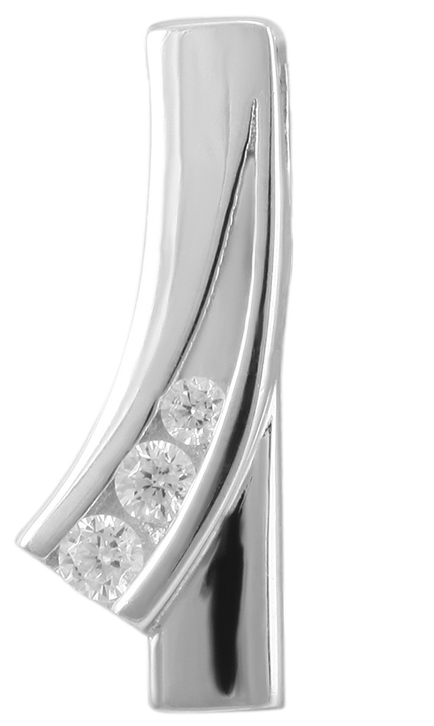 O pingente feminino simples, mas elegante, é feito de prata esterlina 925 e adicionalmente banhado a ródio. O revestimento de ródio protege sua peça preferida de manchas e garante brilho duradouro na superfície. O formato do pingente segue verticalmente para baixo, onde há 3 pedras brilhantes de zircônia em um canal. O olhal do reboque está firmemente integrado e não pode ser removido. Ao adquirir o produto, observe que a corrente não está incluída. O tamanho do pingente é 20 mm de comprimento, 8 mm de largura e 4 mm de espessura.