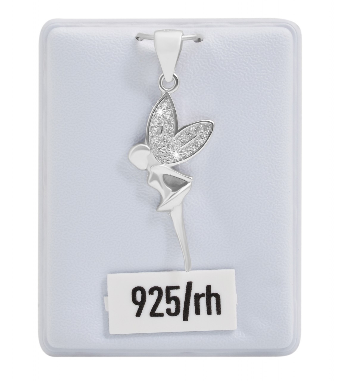 O pingente de corrente em forma de fada feito em prata de lei 925 é banhado a ródio, por isso é à prova de manchas e tem um brilho duradouro. As asas da criatura mítica são decoradas com 20 pequenas pedras de zircônia. Este detalhe fino torna o pingente um atrativo elegante que pode ser usado em diversas ocasiões. Também é ideal como presente. O item tem dimensões de: comprimento 26 mm, largura 12 mm e espessura 2 mm.