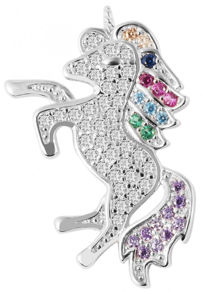 O pingente em forma de unicórnio é feito de prata esterlina 925 e adicionalmente refinado com um revestimento de ródio de alta qualidade. Essa camada protege o material de manchas e também garante brilho duradouro. Isso também é garantido por 38 pedras de zircônia que decoram decorativamente o pingente de unicórnio. A crina e a cauda do unicórnio são decoradas com pedras de zircônia multicoloridas. O pingente possui um ilhó…