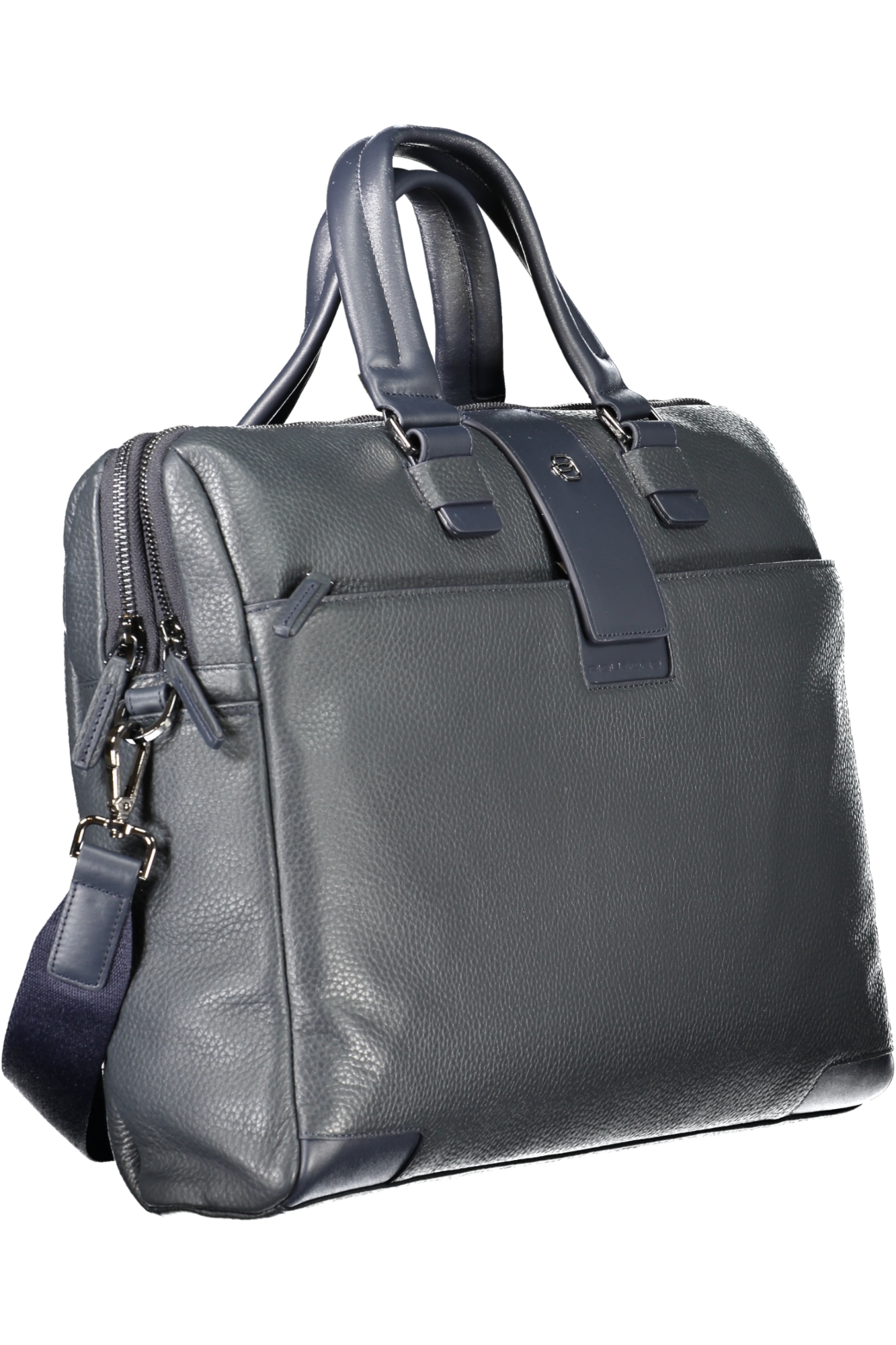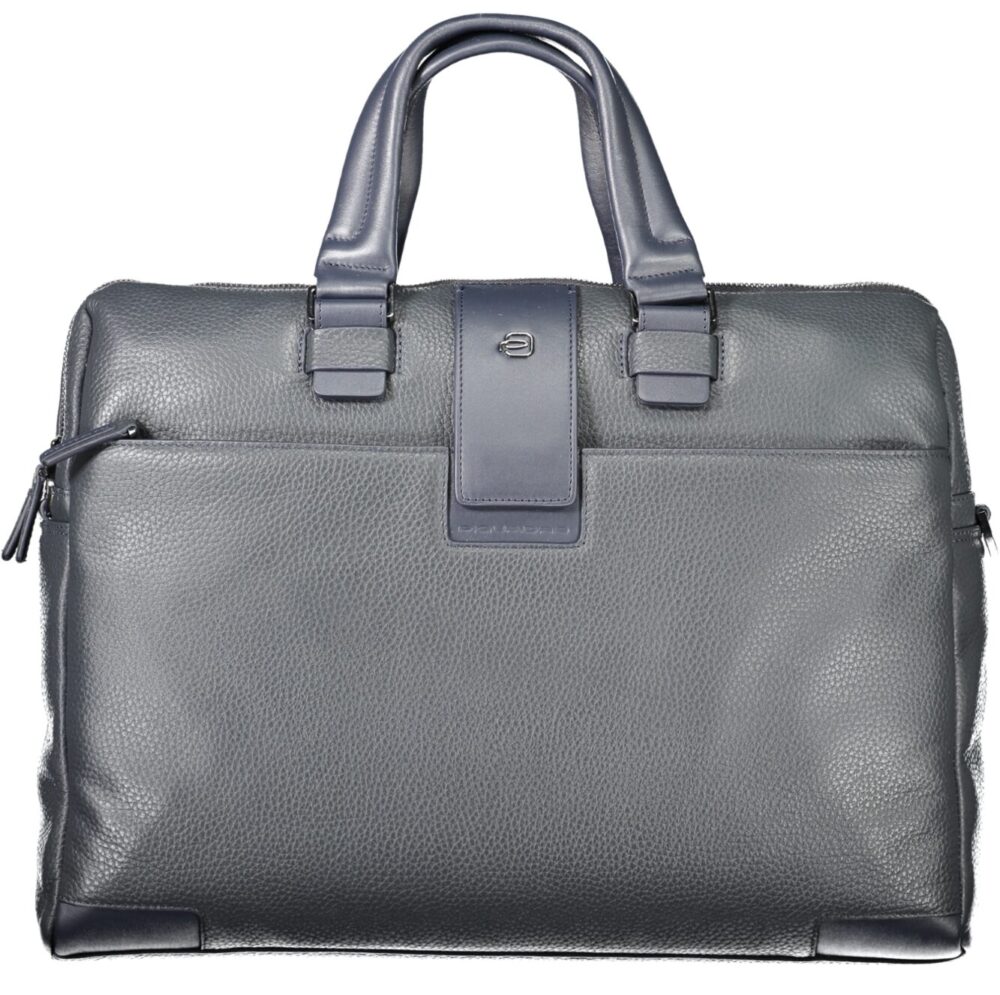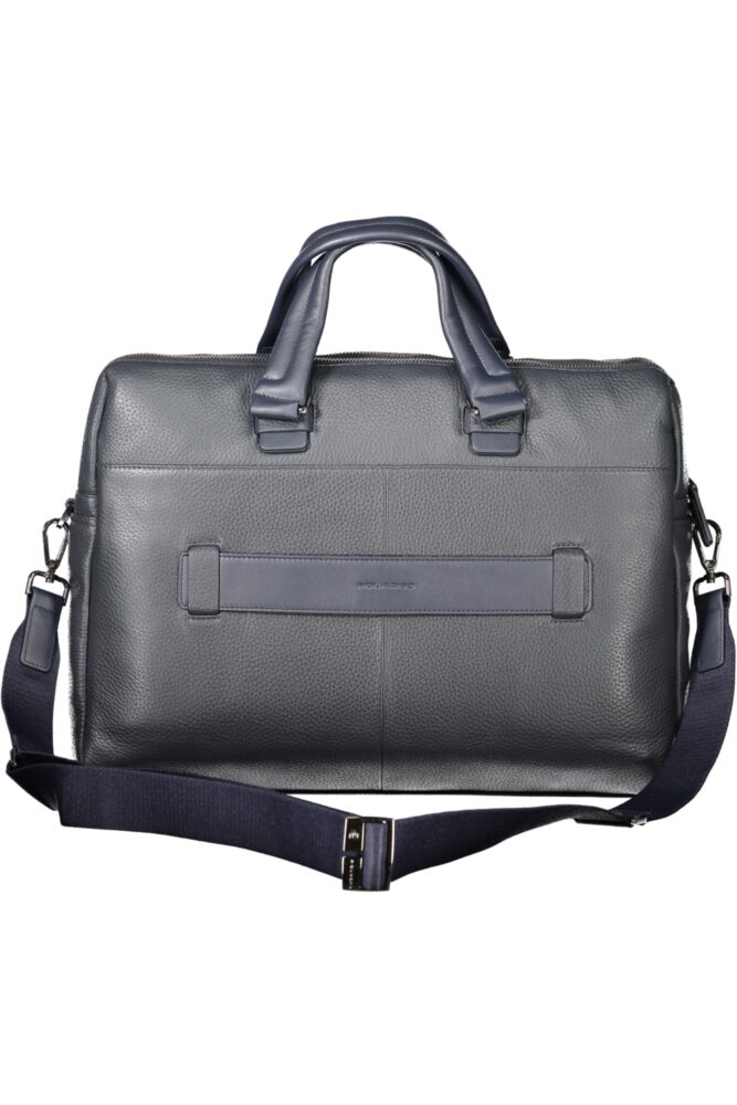 Mala com 2 alças, alça de ombro ajustável e removível, 1 bolso externo, 2 compartimentos separados, 1 bolso interno, espaços internos para laptop, canetas e documentos, detalhes contrastantes, fecho de zíper, logotipo