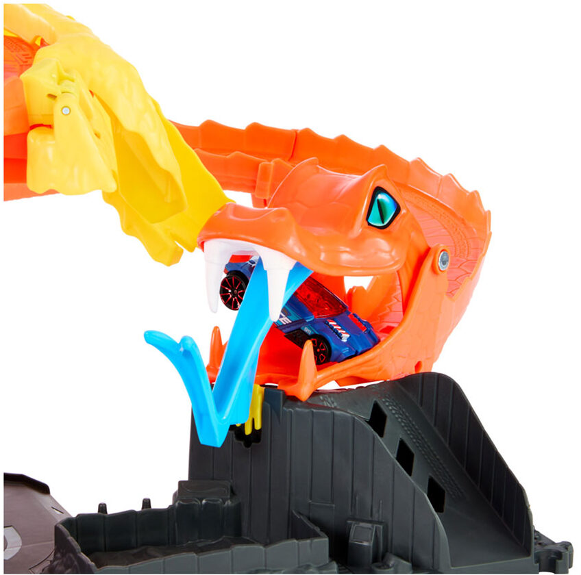 Quando as crianças soltam a cauda da cobra incluída, ela envia os seus carros para um de 3 caminhos, escolhidos aleatoriamente e repletos de suspense e aventura.