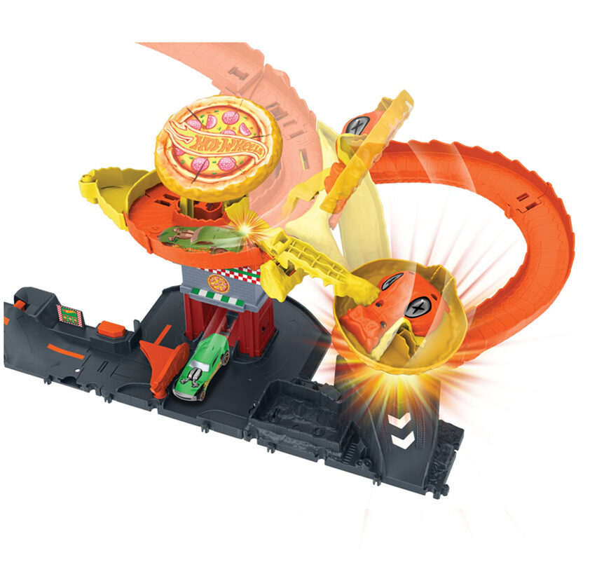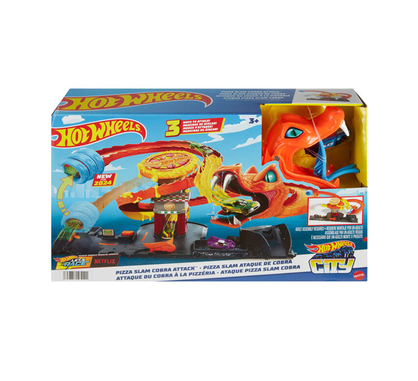 Inclui: Conjunto de Pistas de carros de Brinquedos Hot Wheels City; Pizza Slam Cobra Attack; Pista em Espiral Cauda de Cobra com Aleatorizador; 1 Veículo à escala 1:64.