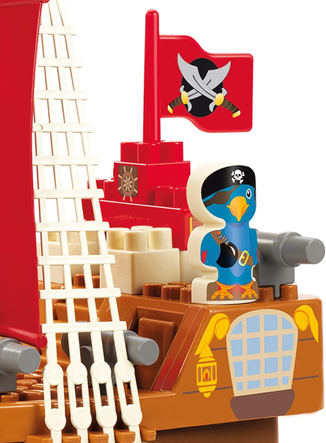 - Ao embarque. Este barco pirata de blocos de construção inclui 29 peças, entre as quais 3 canhões, 1 baú de tesouro, 2 piratas e 1 papagaio