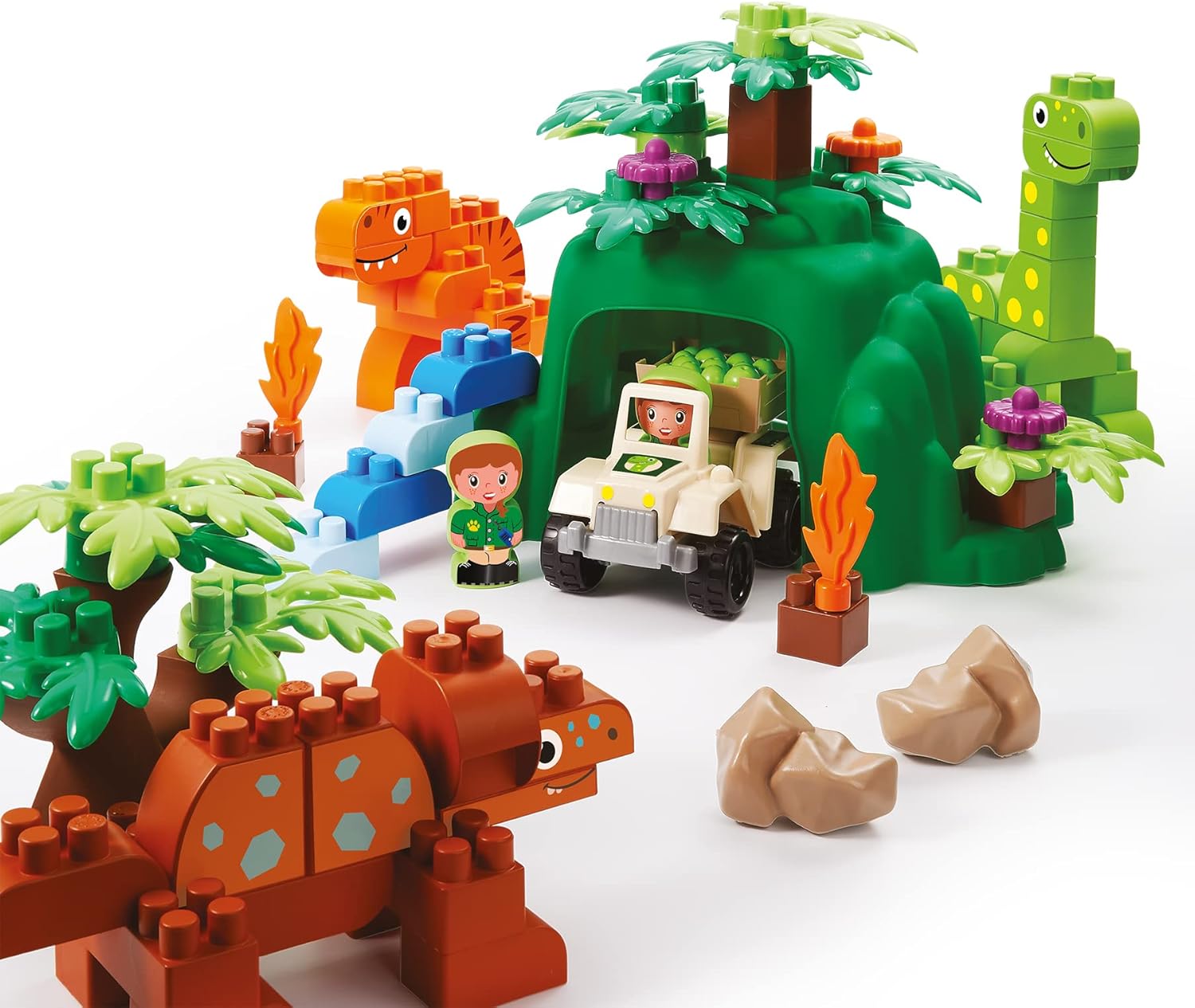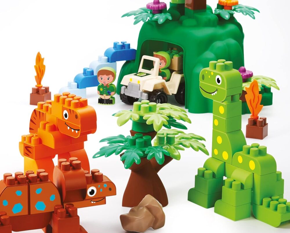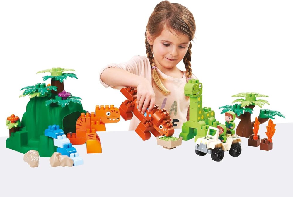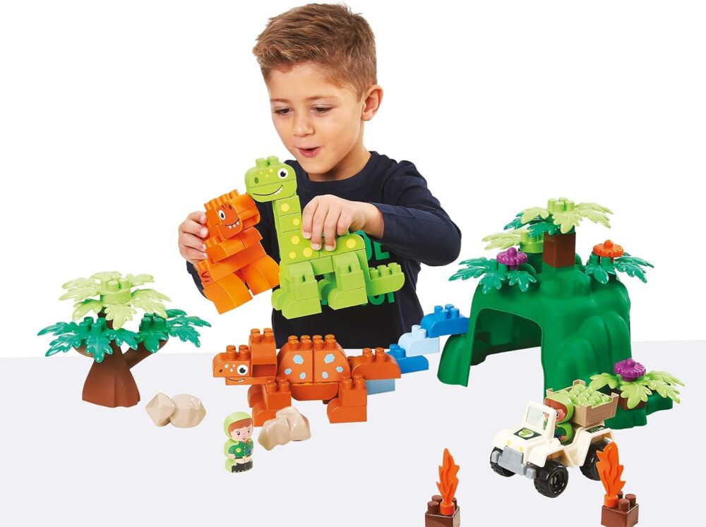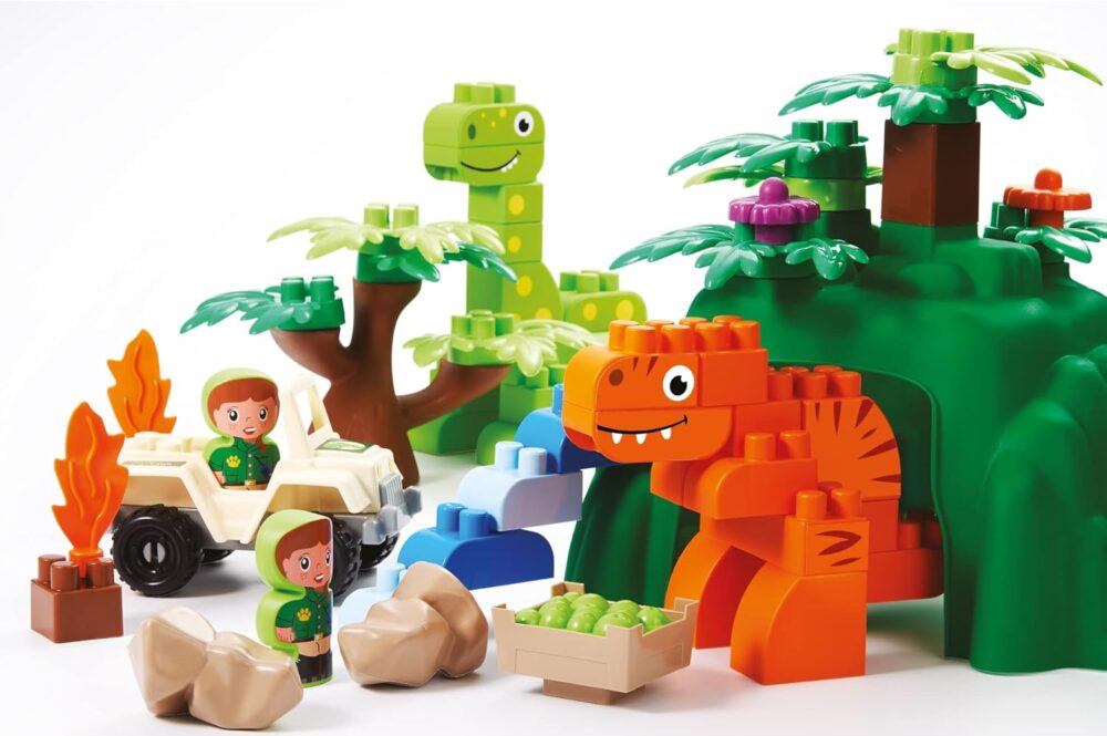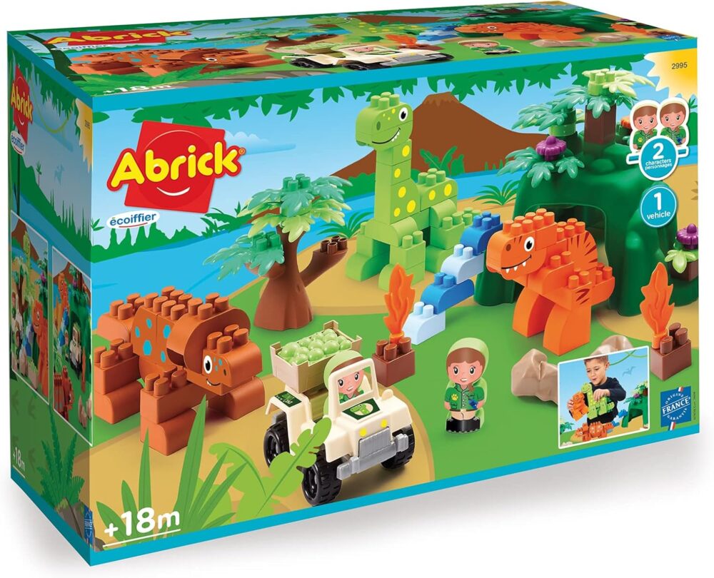 - O brinquedo de construção Abrick Dino Land inclui três dinossauros para construir com tijolos, uma ilha, um veículo todo-o-terreno e 2 personagens.