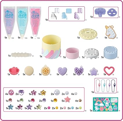 - Frost ‘n’ Decorate Rainbow Paste Craft Kit comes complete com 3 pastes diferentes do pátio, e 7 bases de artesanato inspiradas diferentes que podem ser usadas como uma aderência, caixa de treasure box, suporte fotográfico e chaves! Com o suporte Rainbow Paste, pode squeeze 3 cores paste por onze.