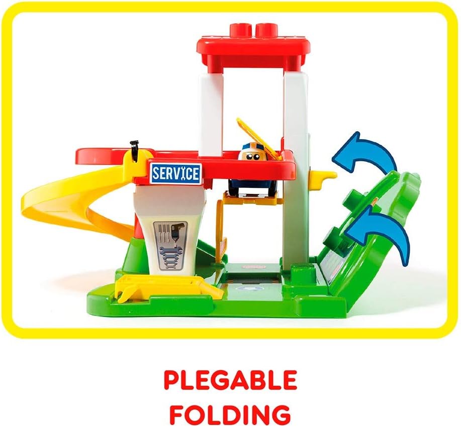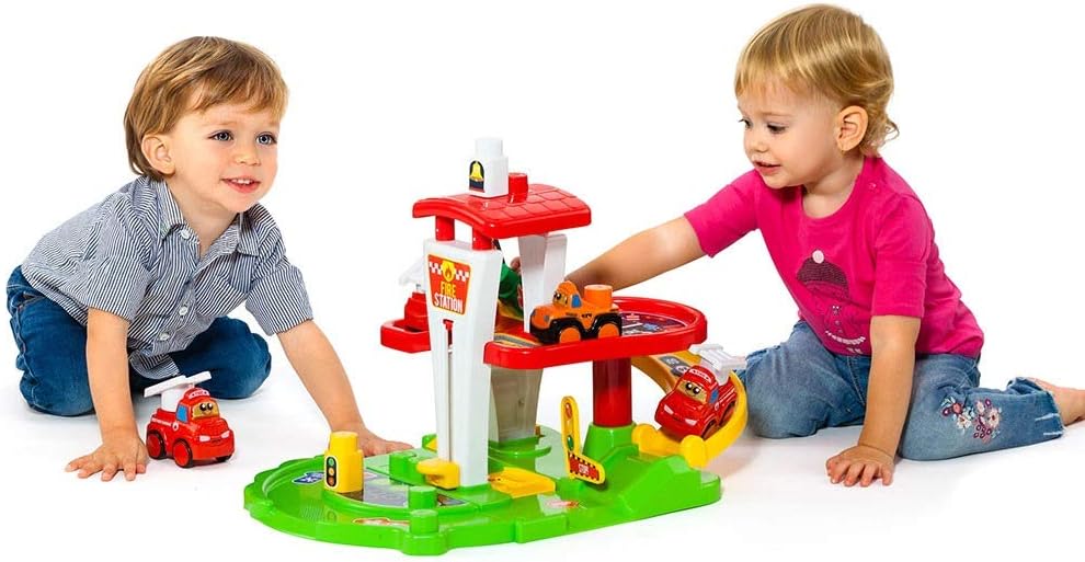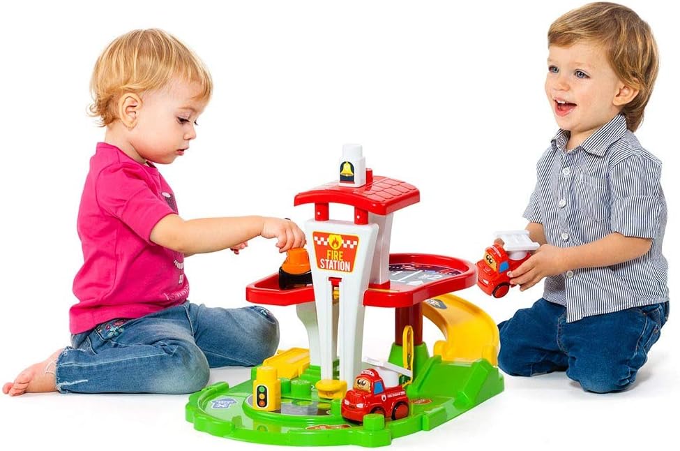 • A divertida estação de bombeiros, inclui um elevador, centro de lavagem e rampas divertidas para deslizar os carros