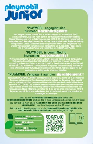 - Sustentabilidade: A PLAYMOBIL JUNIOR é fabricada com mais de 90 % de plásticos à base de plantas. Para as nossas embalagens, utilizamos pelo menos 90% de cartão reciclado e 100% de papel reciclado, evitando o máximo possível o plástico