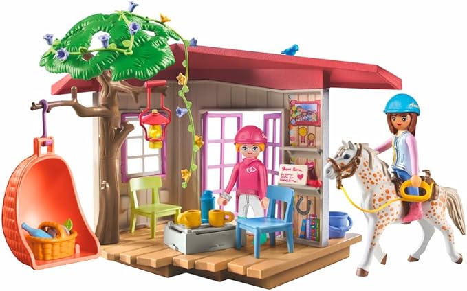 - Acessórios variados: O conjunto inclui um aconchegante clubhouse com um baloiço e um esconderijo secreto, duas cadeiras, uma mesa, capacetes de equitação e acessórios adicionais. Perfeito para jogos de RPG imaginativos e aventuras a cavalo