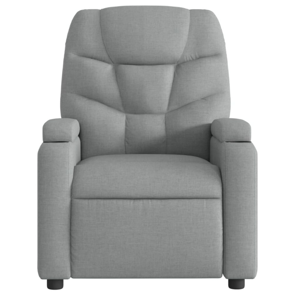 Sente-se e relaxe nesta poltrona de massagens reclinável elétrica altamente confortável! Função de reclinação elétrica: esta poltrona reclinável está equipada com um motor elétrico que permite ajustar automaticamente o encosto e o apoio de pés para qualquer posição, de acordo com as suas necessidades de conforto, com um simples toque no botão existente na parte lateral. Este recurso permite uma inclinação máxima de 135 graus. Além disso, o encosto pode voltar para a posição original rápida e facilmente se premir o botão.Função de vibração: os 6 pontos de massagem permitem que experiencie uma massagem mais bem orientada. O controlo manual incluído permite-lhe ainda escolher diferentes programas de massagem. A função de massagens é alimentada pelo conector USB que exige uma fonte de alimentação USB certificada de 5V (não incluída).Experiência de assento confortável: o assento e encosto espessamente acolchoados e os apoios de braços largos cobertos de tecido proporcionam uma sensação quente e aconchegante, fazendo-o sentir-se abraçado enquanto está sentado. O tecido apresenta um aspeto simples e liso, sendo também respirável e durável.Suportes de copos e bolso lateral convenientes: esta poltrona possui dois convenientes suportes de copos para as suas bebidas e um bolso lateral para manter os seus artigos essenciais ao alcance.Estrutura sólida e estável: a estrutura feita de madeira e metal proporciona uma estrutura forte e estável. Esta poltrona reclinável é confortável e durável.