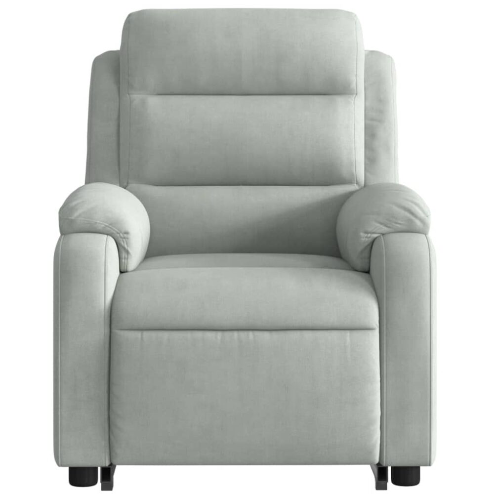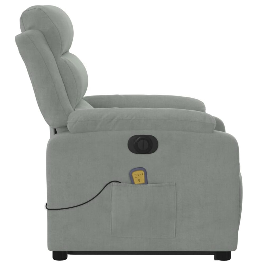Sente-se e relaxe nesta poltrona reclinável, elevatória e elétrica de massagens altamente confortável! Função elevatória: a poltrona reclinável para idosos está equipada com um motor elétrico para a função de elevação. Graças à função que empurra toda a poltrona para cima, pode facilmente levantar-se sem criar desconforto às suas costas e joelhos com o simples premir de um botão.Função de reclinação elétrica: esta poltrona reclinável está também equipada com um motor elétrico que permite ajustar automaticamente o encosto e o apoio de pés para qualquer posição, de acordo com as suas necessidades de conforto, com um simples toque no botão existente na parte lateral. Este recurso permite uma inclinação máxima de 135 graus. Além disso, o encosto pode voltar para a posição original rápida e facilmente se premir o botão.Função de vibração: os 6 pontos de massagem permitem que experiencie uma massagem mais bem orientada. O controlo manual incluído permite-lhe ainda escolher diferentes programas de massagem. A função de massagens é alimentada pelo conector USB que exige uma fonte de alimentação USB certificada de 5V (não incluída).Experiência de assento confortável: o assento e encosto espessamente acolchoados e os apoios de braços largos cobertos de veludo proporcionam uma sensação quente e aconchegante, fazendo-o sentir-se abraçado enquanto está sentado. O veludo é um tecido macio e confortável que proporciona uma boa sensação em contacto com a pele.Bolso lateral conveniente: esta poltrona possui um bolso lateral para o seu controlo remoto ou para manter os seus artigos essenciais ao alcance.Estrutura sólida e estável: a estrutura feita de madeira e metal proporciona uma estrutura forte e estável. Esta poltrona reclinável é confortável e durável.